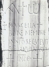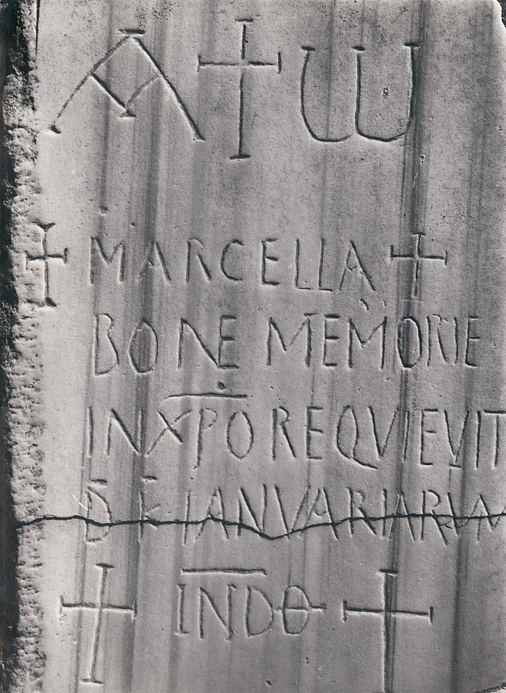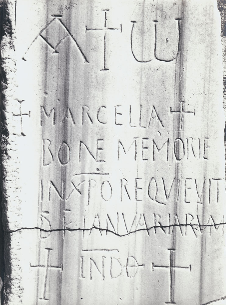 (Alpha and Omega on either side of a cross) (cross) Marcella (cross) Of good memory, she went to rest in Christ on January the first, in the ninth indiction. (cross)