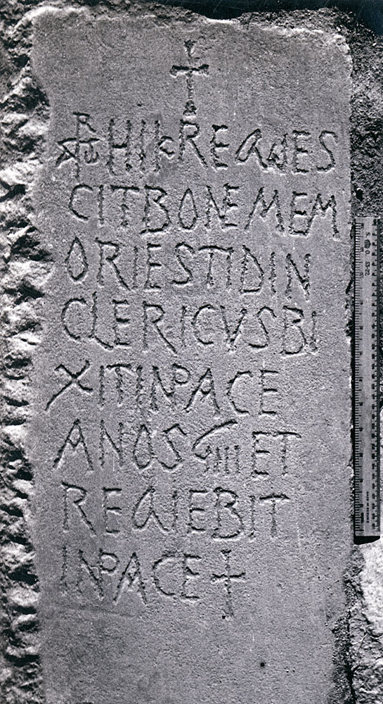 (cross).(Alpha and Omega on either side of a monogram cross) . Here lies at rest Stidin, of good memory, a priest. He lived in peace for 9 years (sic) and went to rest in peace (cross)