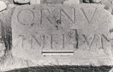 with a moulding along the lower edge and sockets for beams at the back; inscribed on the face, considerably weathered.