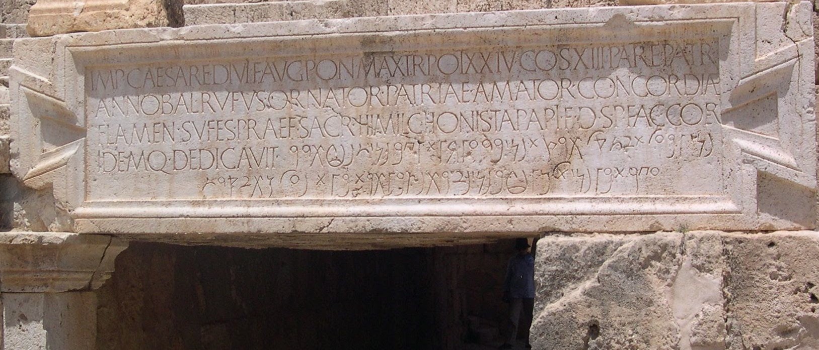 i. When Emperor Caesar Augustus, son of the deified (scil. Caesar), chief priest, (scil. was) holding tribunician power for the twenty-fourth time, consul for the thirteenth, father of the country, Annobal Rufus, adorner of his country, lover of concord, flamen (local priest), sufete, in charged of sacred things, son of Himilcho Tapapius, saw to the construction at his own expense and also dedicated it.