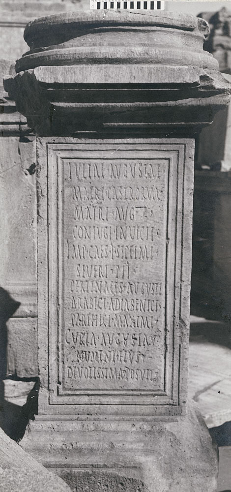 To Julia Augusta mother of the camps, mother of the two Augusti, (revised to the singular) wife of the unconquered Emperor Caesar Lucius Septimius Severus Pius Pertinax Augustus, victor in Arabia, victor in Adiabene, greatest victor in Parthia; the Curia Augusta, deeply devoted to her divine power, set this up.