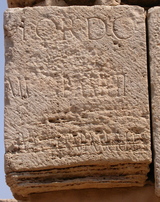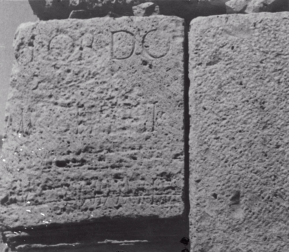 Letters: Lettering: line 1 (lapidary capitals), 0.065; remainder (Rustic capitals), line 2, 0.06; line 3, 0.055.