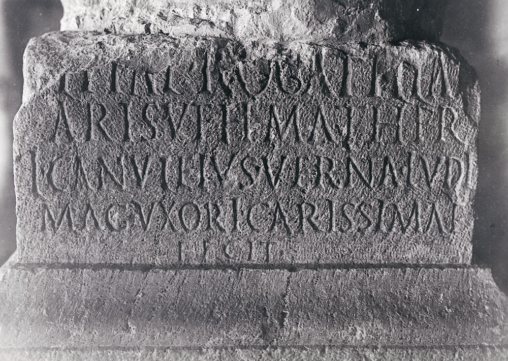 To Ulpia Rogatilla Arisuth Mather; Lucius Canuleius Verna, master (scil. ?of the school), had this made for his very dear wife.